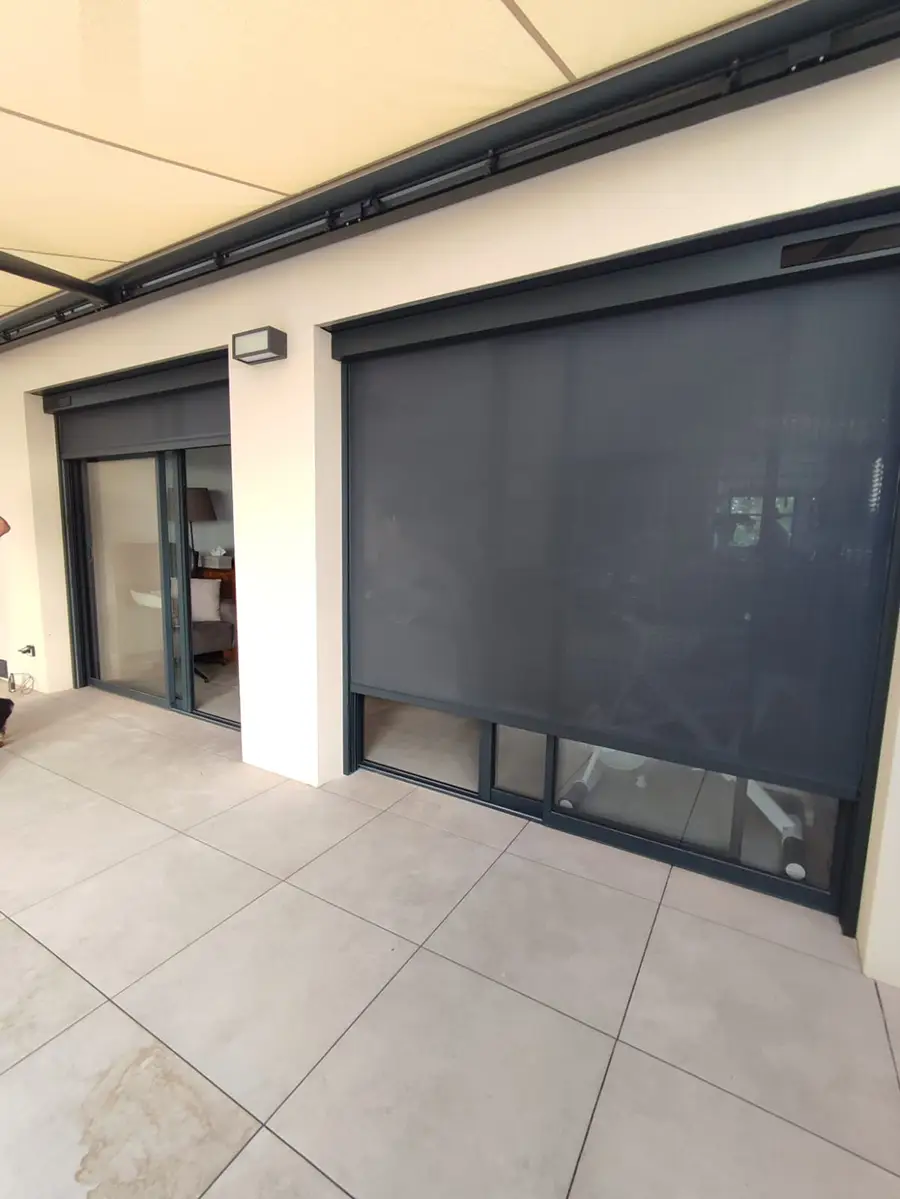 En complément du store banne, nous avons installé deux stores zip microperforés, signés Komilfo, sur les portes-fenêtres du client. Ces stores offrent une solution d’ombrage supplémentaire, tout en permettant une ventilation naturelle et une visibilité vers l’extérieur. Les microperforations du tissu assurent une circulation d’air tout en bloquant une grande partie des rayons UV, ce qui contribue à maintenir une température agréable à l’intérieur de la maison.