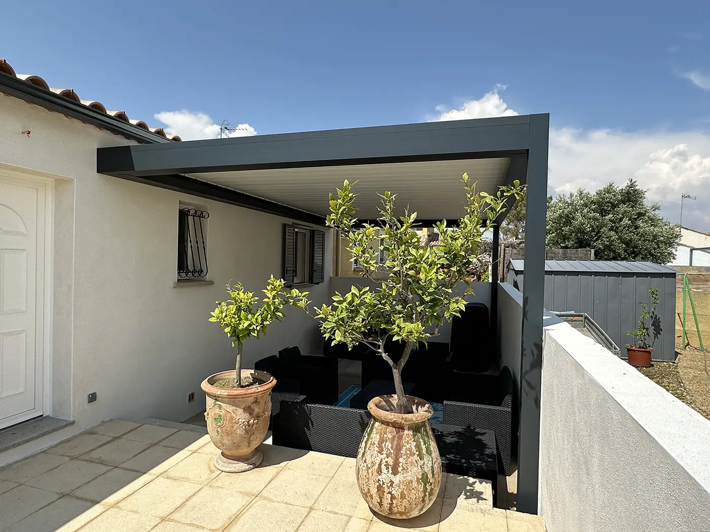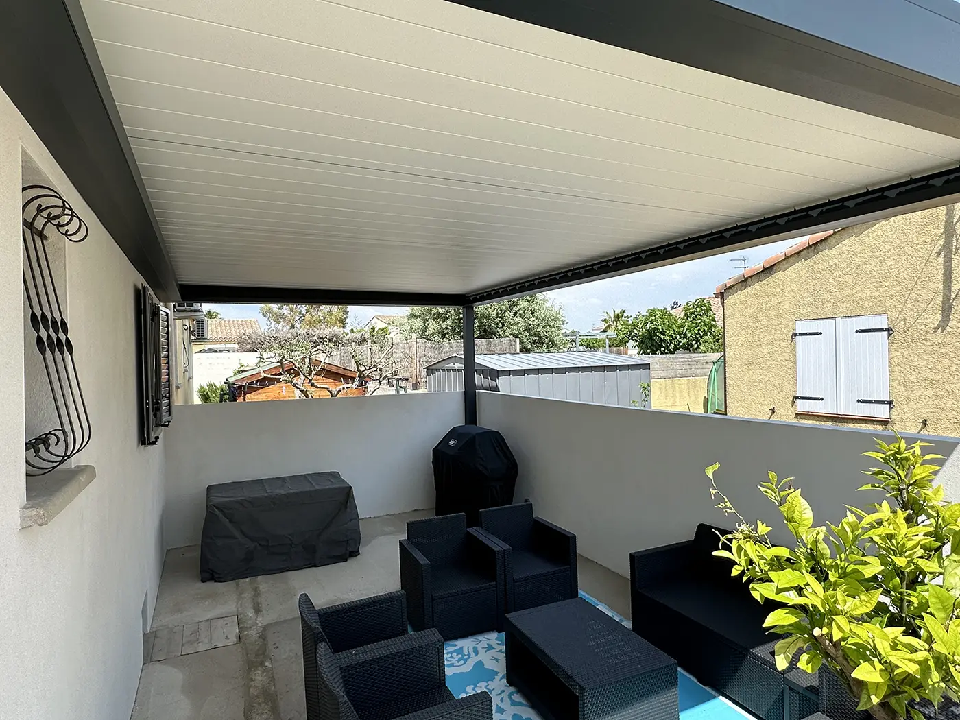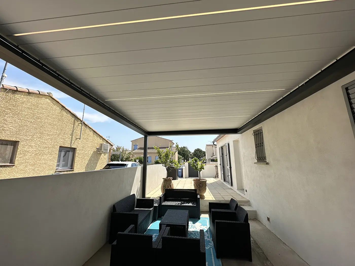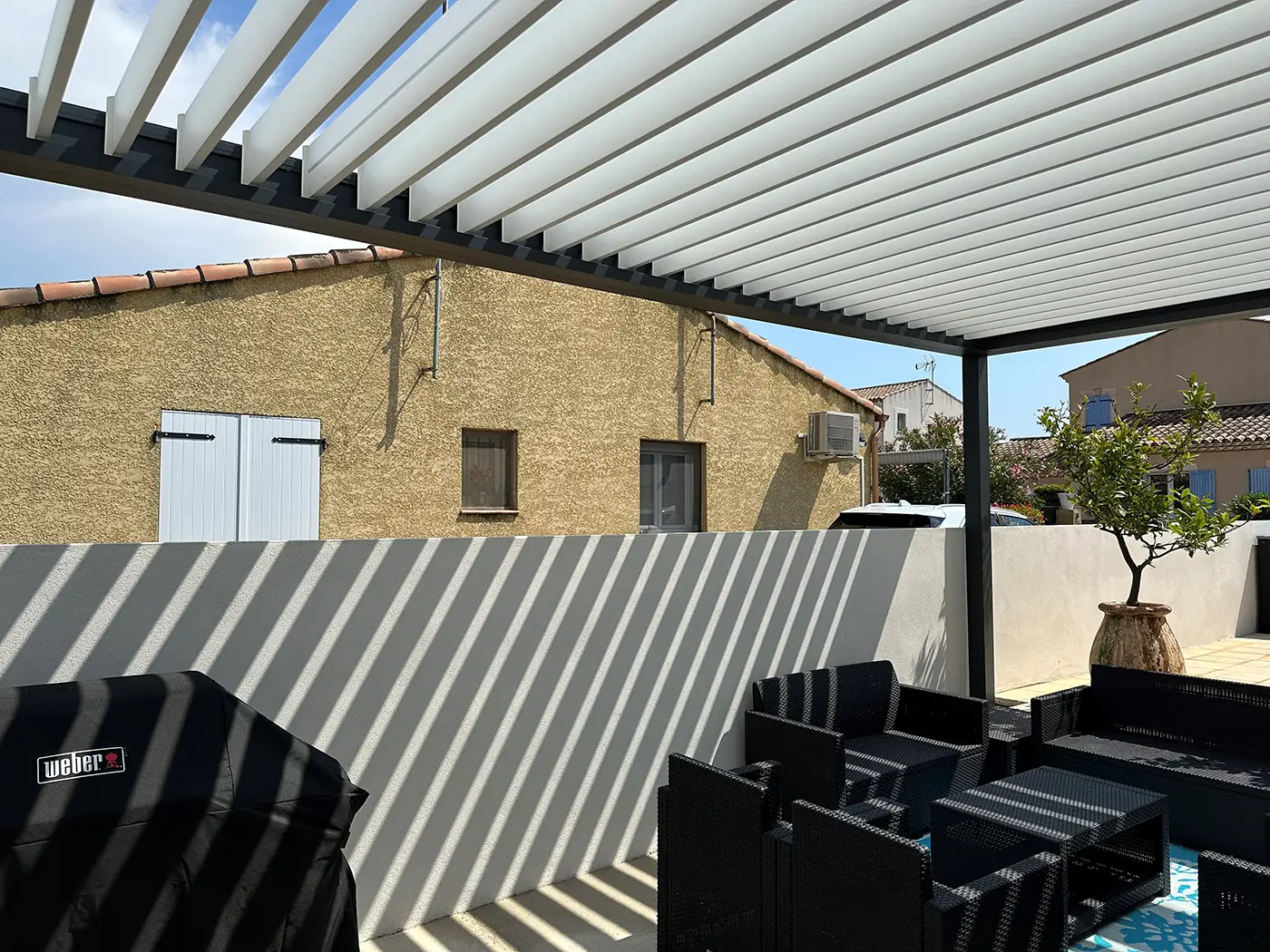 Installation d’une pergola bioclimatique Komilfo à Aigues Mortes, dans le Gard