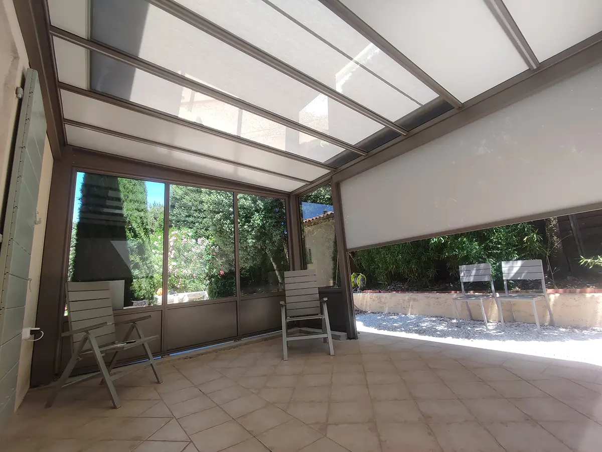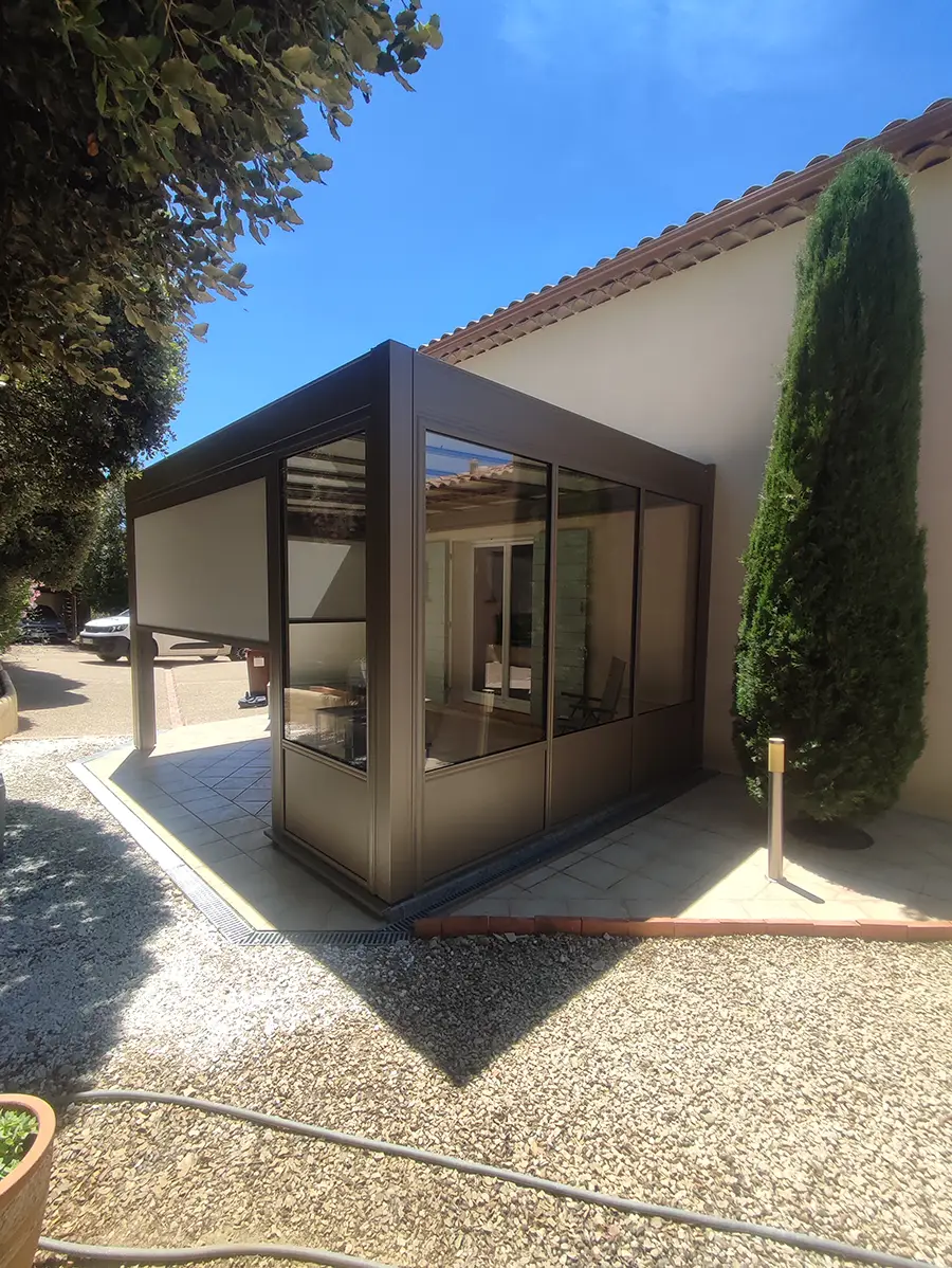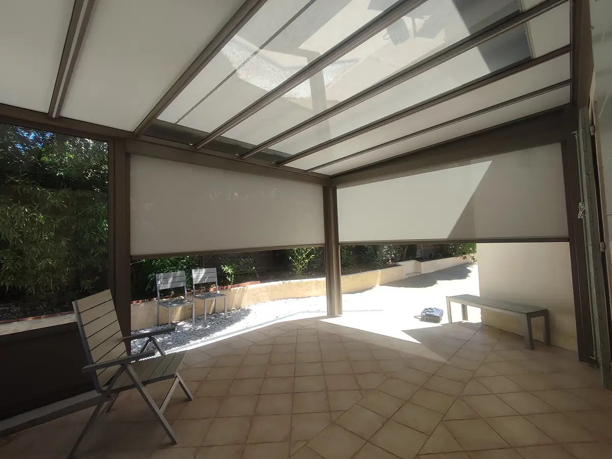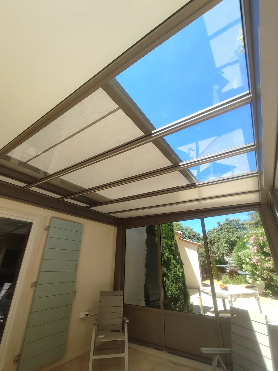 Afin de compléter l’aménagement de la toiture et de répondre aux besoins de notre client, nous avons également installé un store de toiture. Ce store est conçu pour couvrir les puits de lumière en cas de besoin, offrant ainsi une protection supplémentaire contre le soleil direct. Il est facilement ajustable, permettant de réguler la quantité de lumière et de chaleur entrant sous la pergola. Cette fonctionnalité est particulièrement appréciée pour créer un espace confortable tout au long de la journée, quelles que soient les conditions météorologiques.